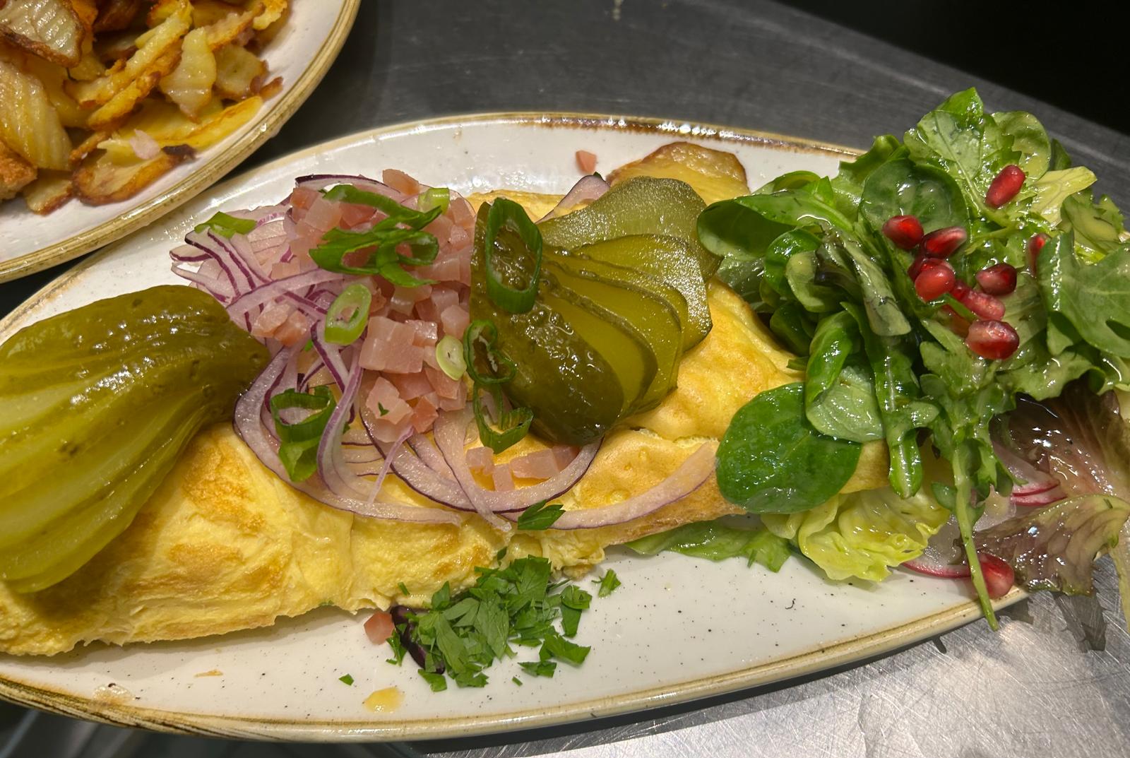 Omelette gefüllt mit knusprigen Bratkartoffeln – mit Schinkenspeck gebraten – garniert mit feinem Lachsschinken, zarten roten Zwieblringen & Gewürzgurke & Salat