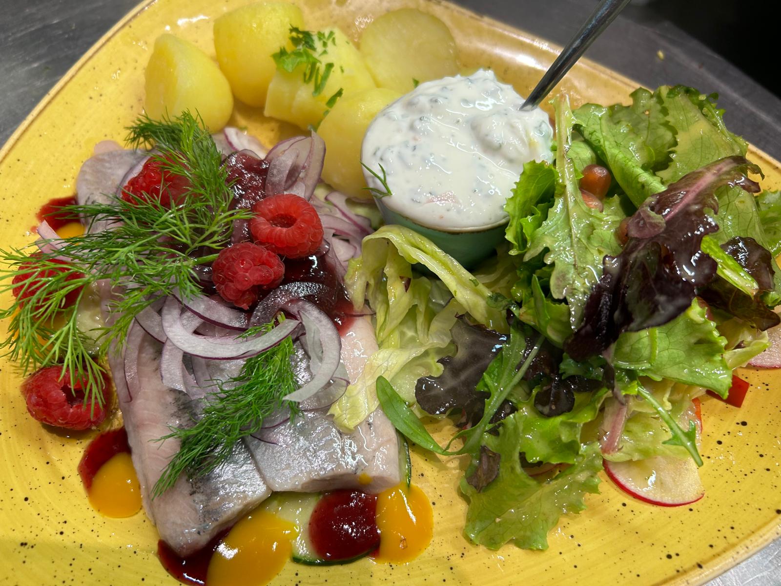 2 Matjesfilets von Friesenkrone auf güner Gurke mit zarten roten Zwiebelringen,Feigensenfkirschdressing, dazu Würfel von der frischen Pellkartoffel mit Kräuterquark -hausgemacht- & Salatgarnitur